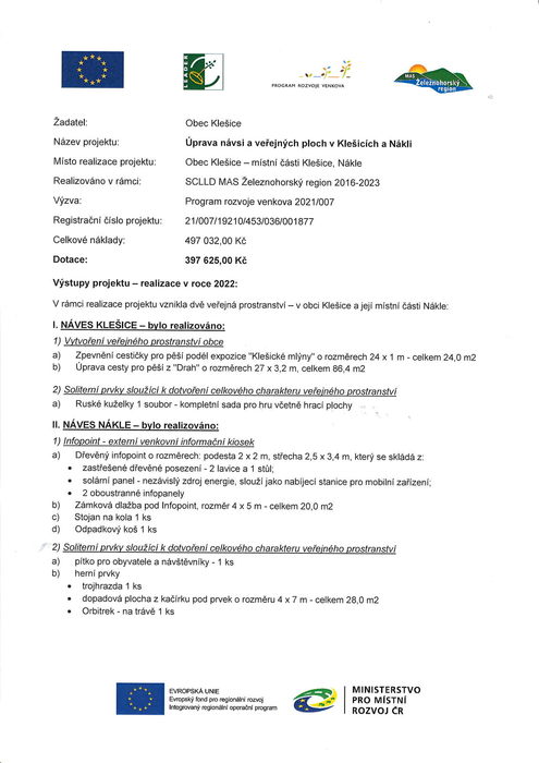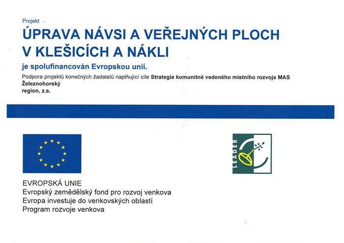 Ve spolupráci s MAS Železnohorský region realizovala Obec Klešice dotační akci z Programu rozvoje venkova (PRV) – článek 20 (Program EU) s názvem Úprava návsi a veřejných ploch v Klešicích a Nákli. Žádost se všemi náležitostmi jsme podali v roce 2021, realizace se uskutečnila v roce 2022. Podrobnější informace a fotografie jsou vloženy - zobrazí se kliknutím na plakát nebo nadpis článku.