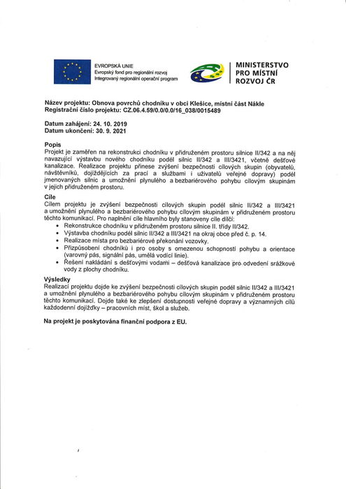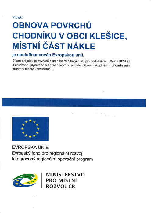 Úvod > Obec > Dotace > Obnova povrchů chodníku v obci Klešice, místní část Nákle