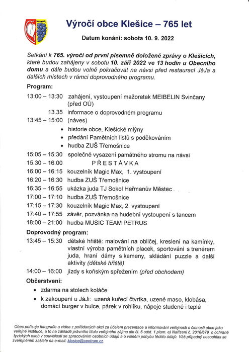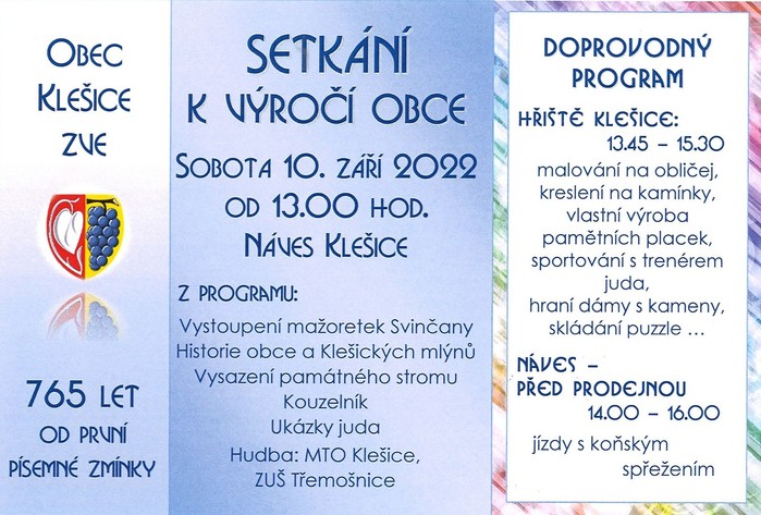 Obyvatelé Klešic a starostové okolních obcí byli pozváni na Setkání k 765. výročí od první písemně doložené zprávy o Klešicích. Konalo se v sobotu 10. září 2022, zahájeno bylo ve 13 hodin u Obecního domu, program pokračoval na návsi před restaurací JáJa a na dalších místech v rámci doprovodného programu. Odpoledne moderoval pan František Mifek. Dík patří všem, kteří pomohli s přípravou i realizací a samozřejmě také všem vystupujícím. Více na fotografiích. MSt