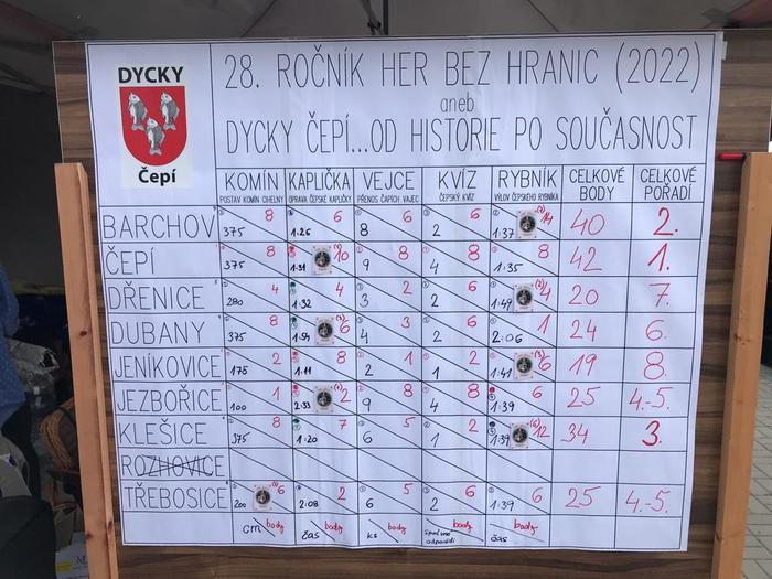 V sobotu, 20.08.2022 se v Čepí konal již 28. ročník Her bez hranic. Přijelo 8 týmů z okolních obcí včetně týmu z Klešic. Své síly si za příjemného, byť trochu větrného počasí změřily v pěti disciplínách. Velké poděkování patří klešickému šestičlennému týmu ve složení Bára, Edita, Lucka, Petra, Lukáš a Petr za bezvadnou reprezentaci naší obce. Při svém prvním startu zástupci Klešic získali krásné třetí místo - díky moc ! MSt