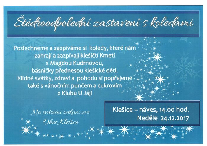 Štědrý den patří již po několik let v Klešicích také ke společnému zastavení obyvatel obce i jejích návštěvníků. Nejinak tomu bylo i v neděli, 24. prosince 2017, kdy jsme se již po sedmé společně sešli ve 14 hodin na návsi u Vánočního stromu při „Štědroodpoledním zastavení s koledami“. Přesto, že počasí Vánoce vůbec nepřipomínalo, sešlo se na 60 návštěvníků.